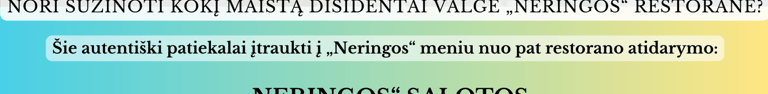 Neišalkai? Žinau, kad kątik pradėjome, bet jei kada norėtum užkąsti su bendraminčiais – Neringos restoranas skirtas būtent tau. Čia nuo seno renkasi Lietuvos inteligentija. Elitinį restoraną, atidaryą 1959-aisiais, įkūrė mano draugai Algimantas ir Vytautas – du broliai architektai. O kas gi buvo ta Neringa? Na, Neringa buvo legenda.