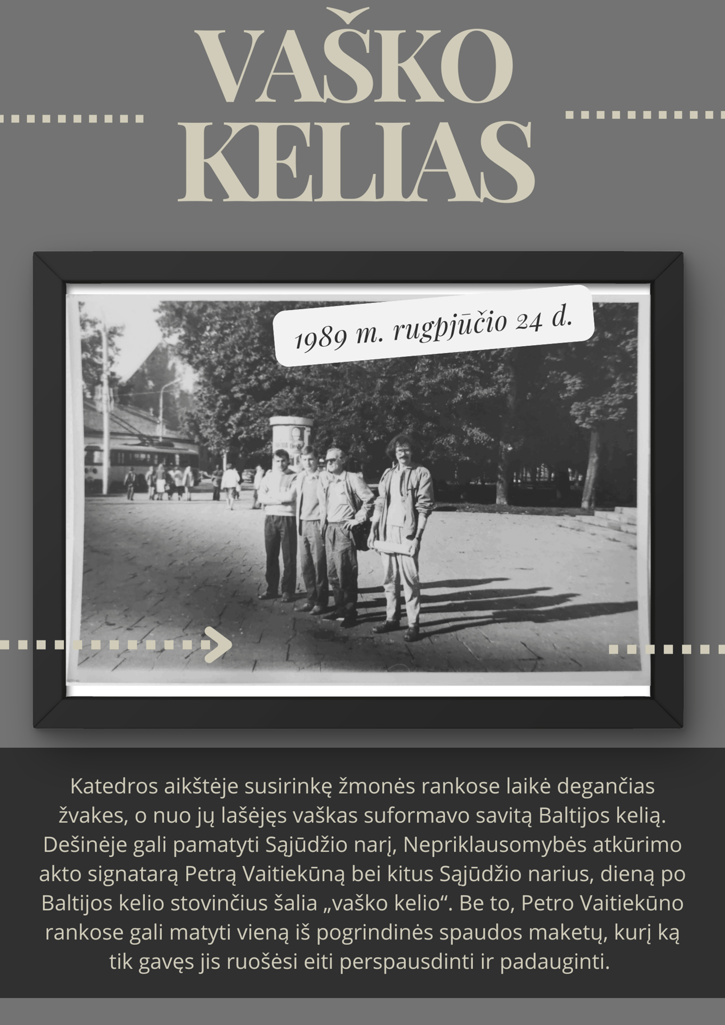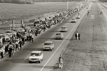 Tautos sustojo į vieningą, rekordinę žmonių grandinę nuo Vilniaus iki Talino. Grandinė prasidėjo prie Gedimino bokšto ir driekėsi per Katedros aikštę link kitų šiaurės Lietuvos miestų ir Latvijos sienos. Visame pasaulyje žinoma Baltijos kelio vardu, ši taiki demonstracija sujungė apie 2 milijonus žmonių, o grandinės ilgis viršijo 690 km. Iniciatyvą Lietuvoje organizavo Sąjūdis, Latvijoje – Tautas fronte, o Estijoje – Rahvarinne. Baltijos kelias nustebino visą pasaulį – tai buvo sėkmingiausias bandymas perteikti teisines ir moralines Baltijos tautų okupacijos problemas.