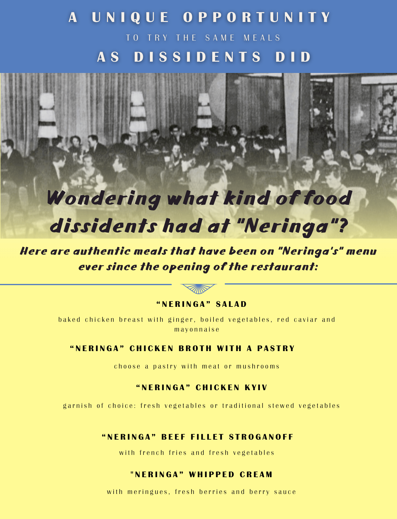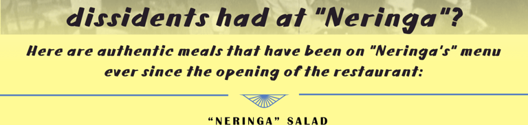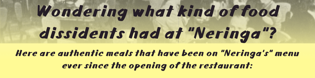 Are you hungry? I know we’ve just started but anytime you want a bite to eat with like-minded people, the Neringa hotel and restaurant is where the liberal intelligentsia of Lithuania would gather. This elite restaurant, which opened in 1959, was built by friends of mine, Algimantas and Vytautas, architects and brothers. Who was Neringa, you ask? Neringa was a legend.